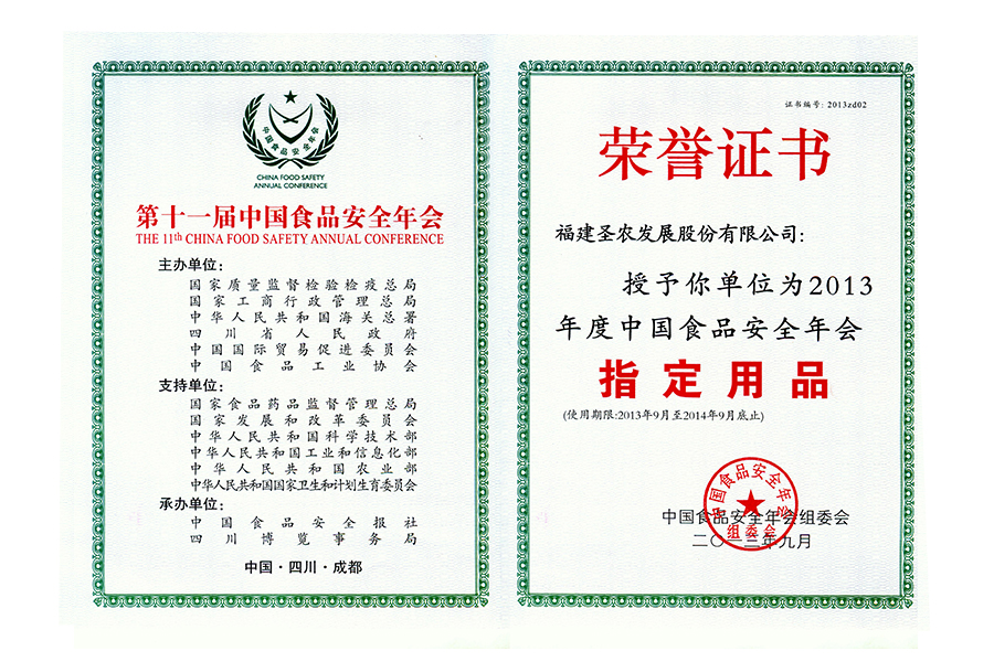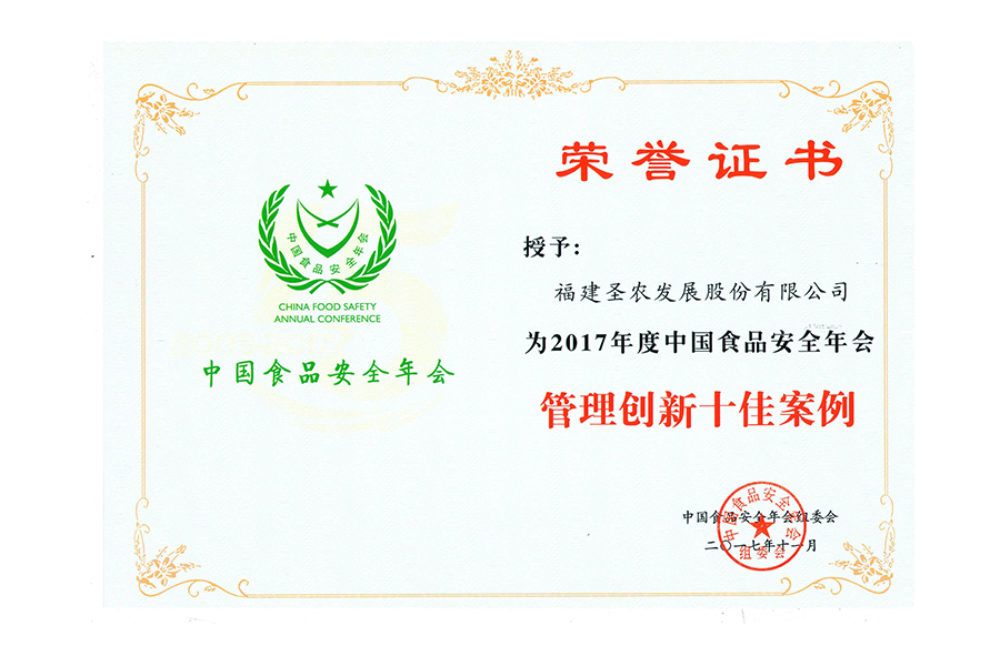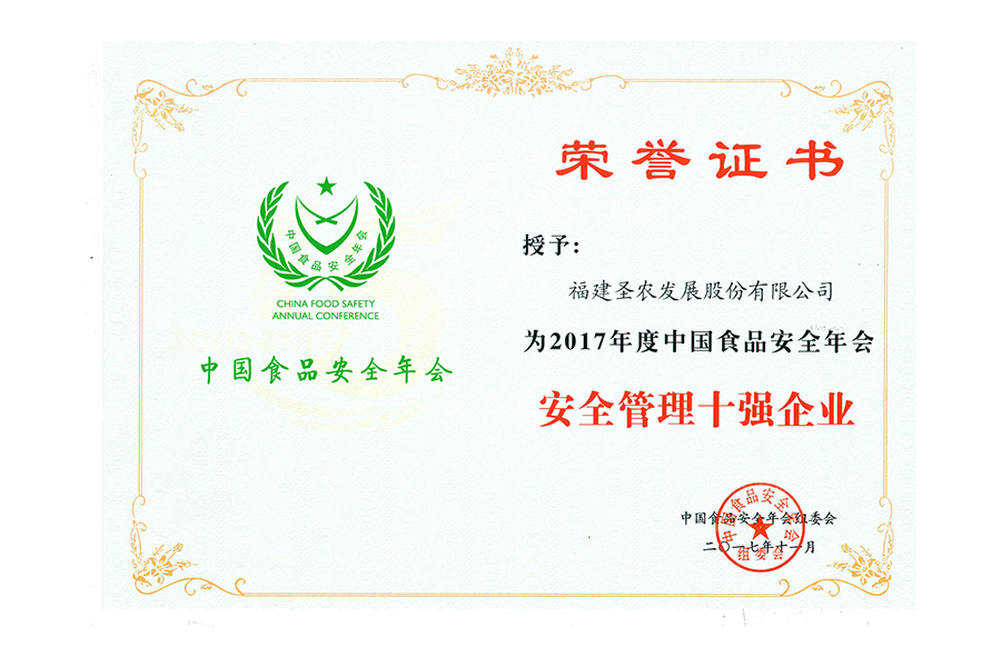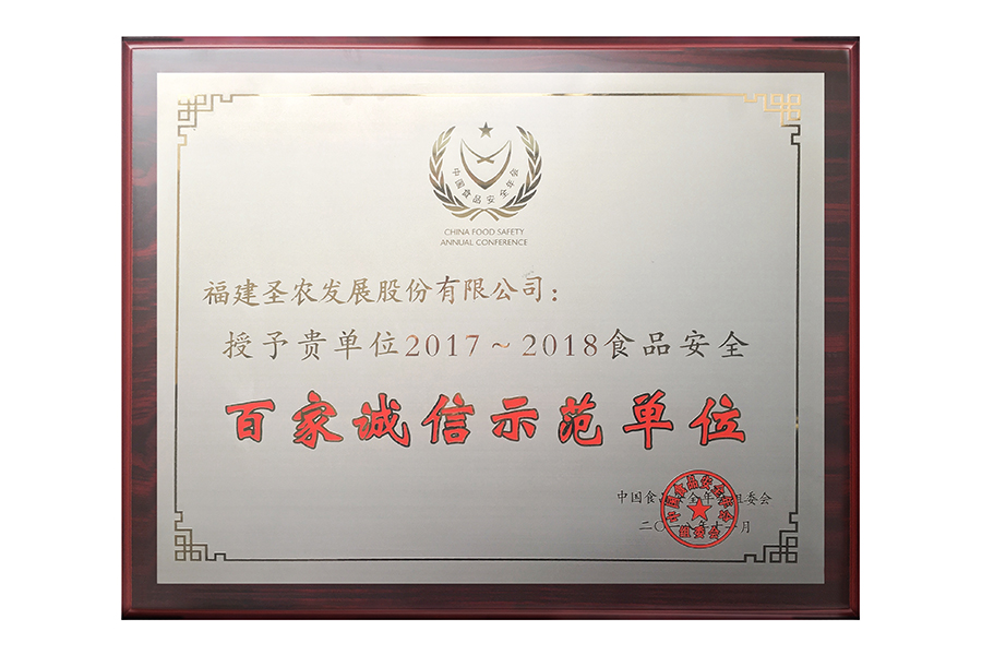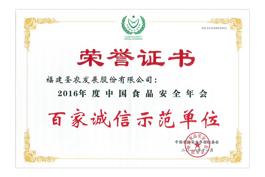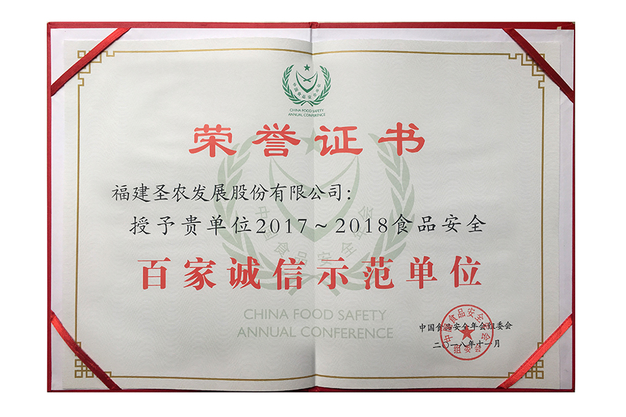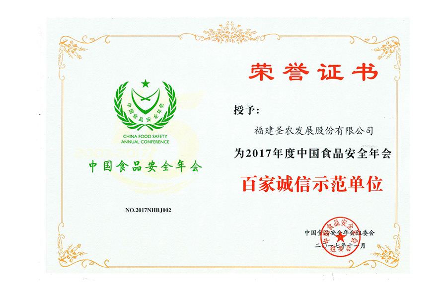 2017年中国食品安全年会 百家诚信示范单位.证书