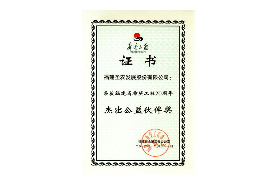 2012年福建省希望工程20周年杰出公益伙伴奖