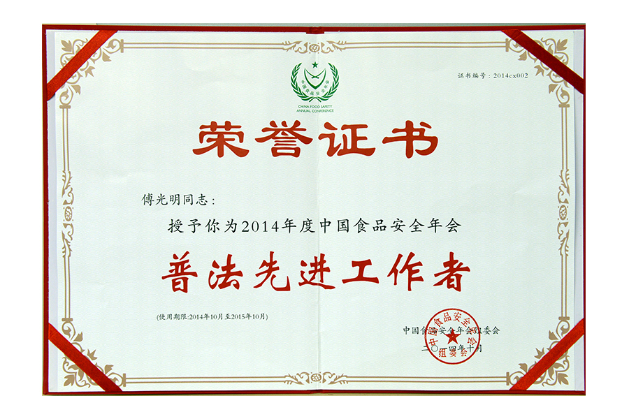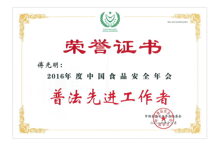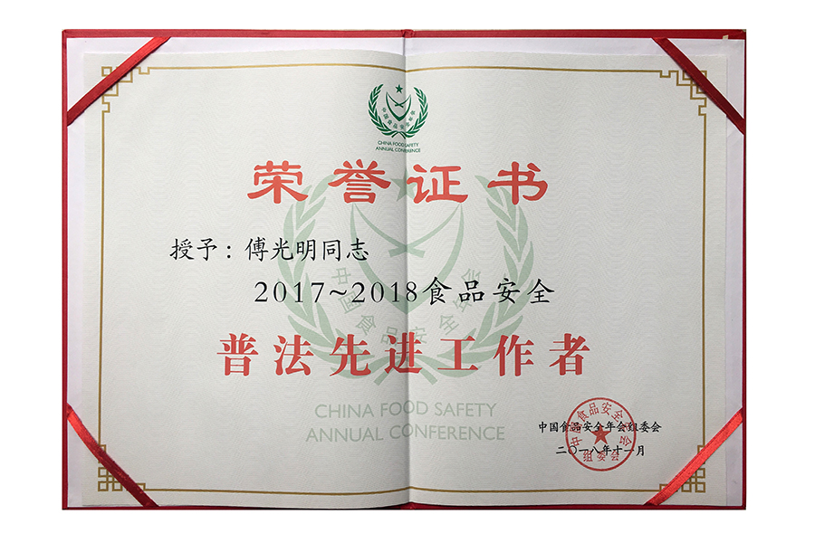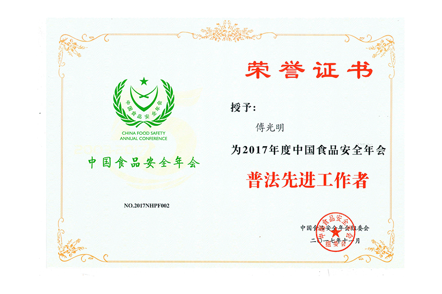 2017年(傅光明)中国食品安全年会.普法先进工作者.北京.证书