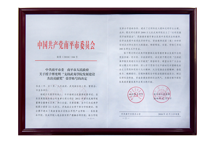 2018年中国南平市委下发通稿(支持武夷学院发展建设杰出贡献奖)