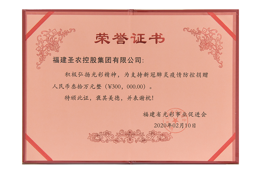 2020年支持新冠疫情防控捐赠三十万荣誉证书